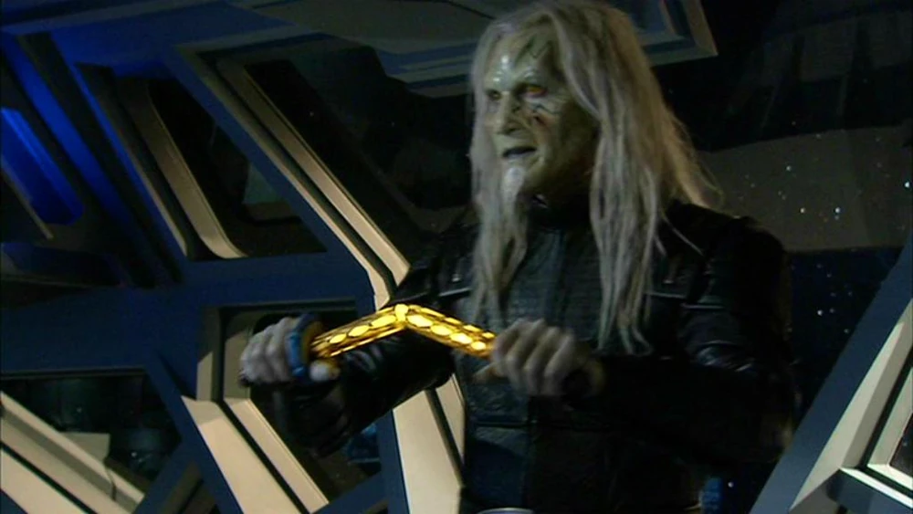 Weapon used by the Goa'uld Ba'al. The shikra blade is a short sword, light and easy to wield, with a thin blade approximately one meter in length. The blade is impossibly sharp, its edge is honed to the thickness of a single atom.